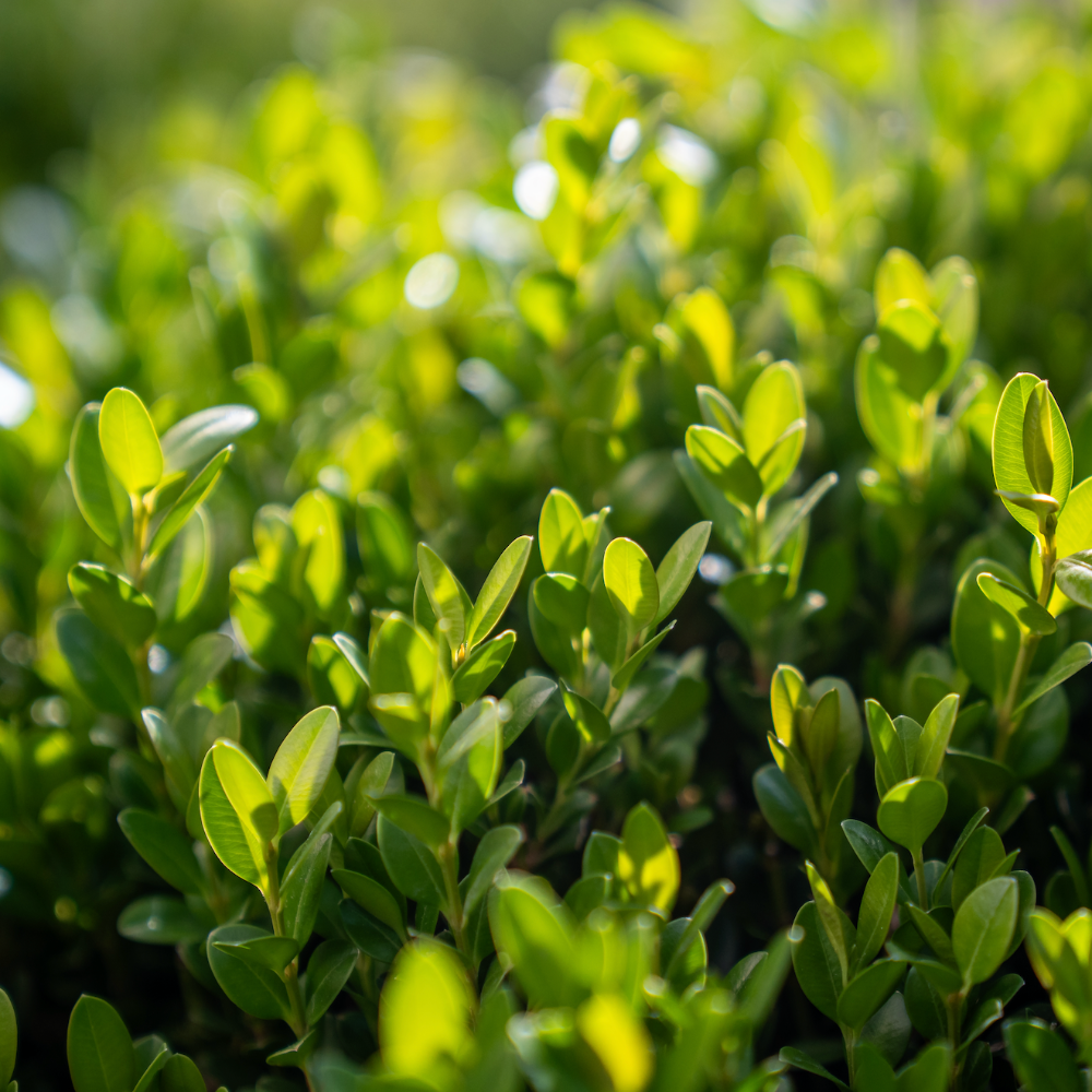 Buxus sempervirens, commonly known as English box. Bushy evergreen shrub with lush green foliage, making this a must for hedging in a formal garden. Very hardy and very forgiving. For a tight hedge, plant at 20cm spacing. Can be kept as low as 30cm in height, but will grow to 1m tall if kept untrimmed.