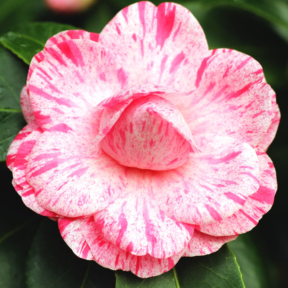 A very showy Camellia with striking peony type blooms. The creamy white petals are all edged lightly in rose pink.