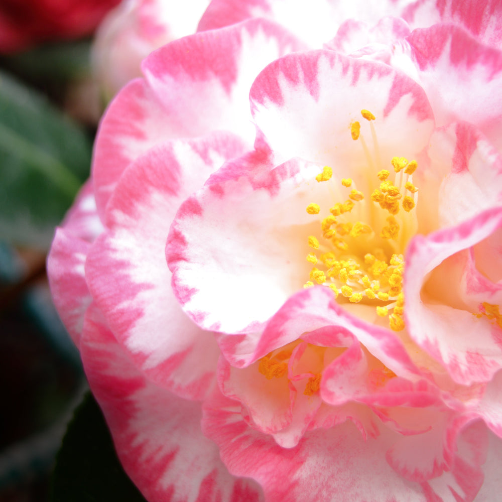 Camellia japonica Nuccios Jewel is an evergreen shrub that produces beautiful, peony like flowers.