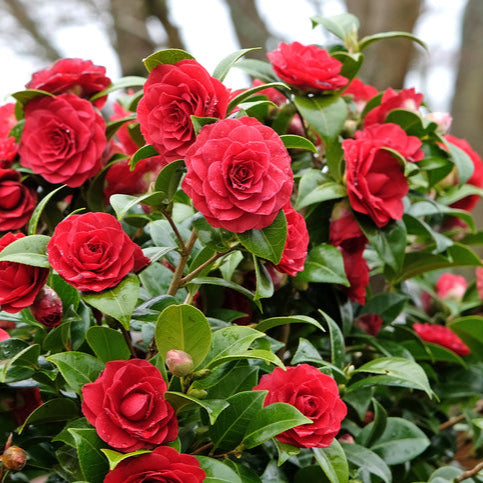 Camellia japonica Red Red Rose produces beautiful, double, bright red flowers. These spectacular blooms appear from winter through spring and blend nicely with the glossy, dark green foliage.