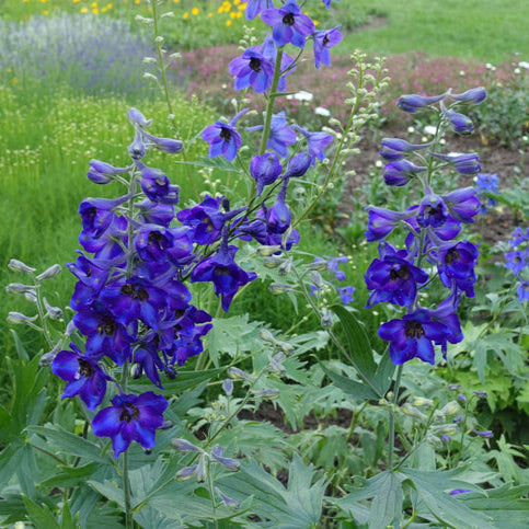 This delphinium is a short lived perennial that is frost hardy and flowers from early spring through to late autumn.