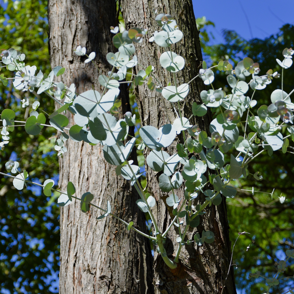 Also known as Cider Gum, is a large evergreen tree of upright conical habit adorned with a dense canopy and smooth bark, flaking off in large pieces. Rich with a sweet fragrance, the aromatic foliage is rounded bright silver-blue when juvenile lance-shaped and bule -green when adult. In summer it produces small clusters of white fluffy flowers.