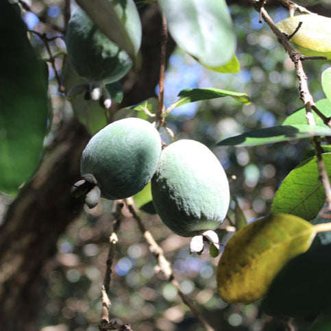 Kaiteri Fejoa is a very early-ripening variety with large, oval, extremely sweet fruit. A reasonably vigorous tree, with an upright habit and large rounded leaves. Requires a pollinator – plant at least two different varieties to guarantee fruit. Lovely red flowers in summer.