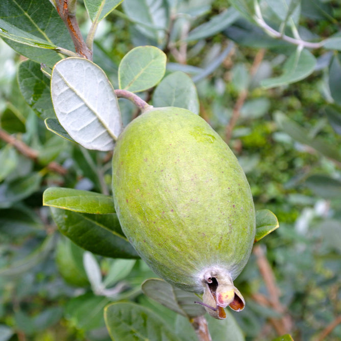 Fejoa Kaiteri is a very early-ripening variety with large, oval, extremely sweet fruit. A reasonably vigorous tree, with an upright habit and large rounded leaves. Requires a pollinator – plant at least two different varieties to guarantee fruit. Lovely red flowers in summer. Performs well in full sun well drained site with good soil. Avoid heavy frosts until established. Evergreen.
