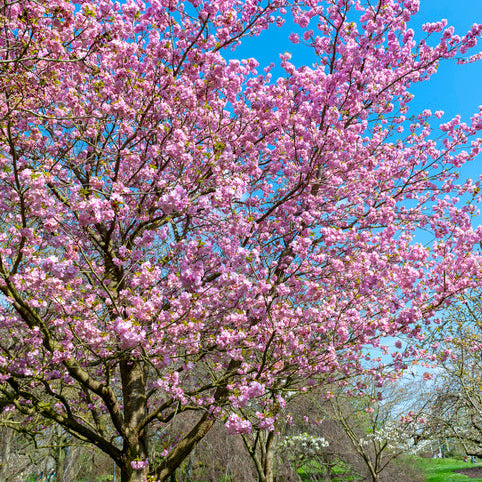 A small tree with broad-spreading gracefully-arching branches. Great for shade or as a statement tree in the garden. Beautiful double-pink flowers open to white and hang on branches in long clusters between October and November, later than other flowering cherries.