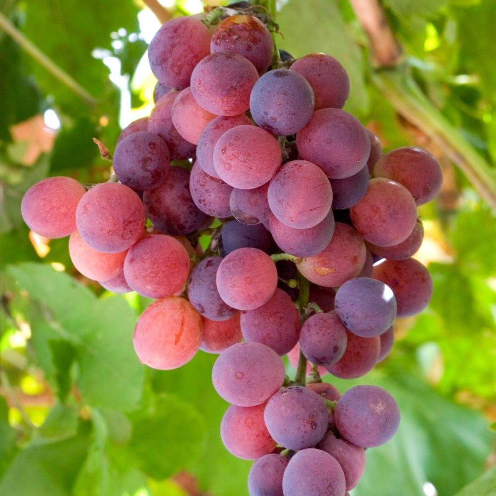 European seedless table grape that has round red fruit with a crisp, firm texture and an excellent sweet flavour. The vine is heavy bearing and the grapes ripen quite early - around about February/March. Happiest in a sunny, sheltered spot in nice free draining loam. Deciduous.