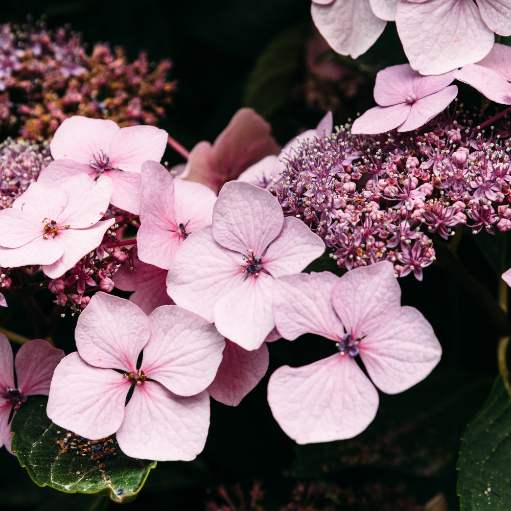 The little flowers will turn blue if you add Aluminium sulphate. Hydrangea ‘Grayswood’ thrives best in part shade and half day sun in well drained soil that doesn’t dry out in summer. Prefers rich acid soil.