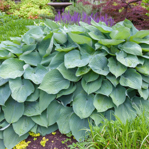 Powdery steel blue leaves retain their color all summer long; one of the best blues ever developed. A lovely little Hosta with the most gorgeous blue-green foliage of good substance. In summer spikes of pale lavender flowers stand above the foliage. Plant in soil that does not completely dry out in summer and protect from slug and snail damage. Perennial.