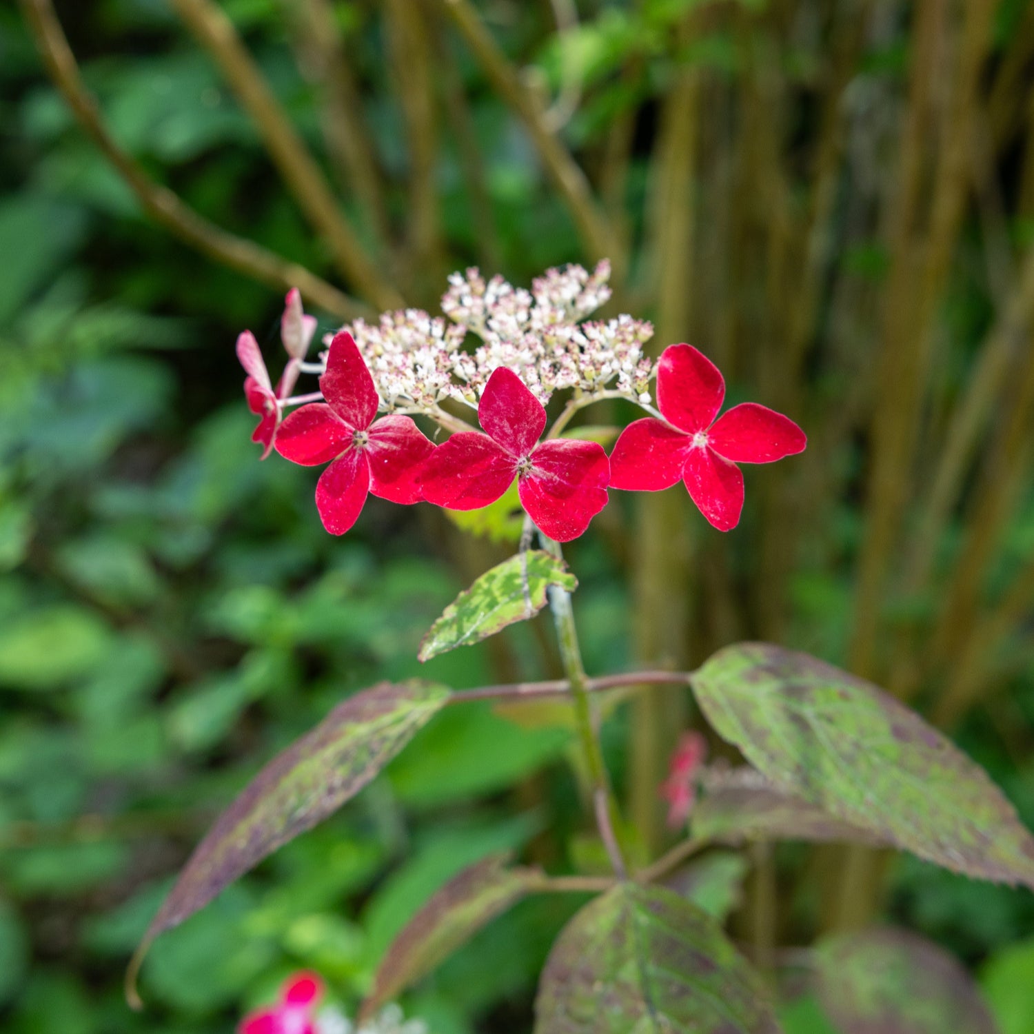 - Flowers: Dramatic lacecap pinky red and white flowers in summer