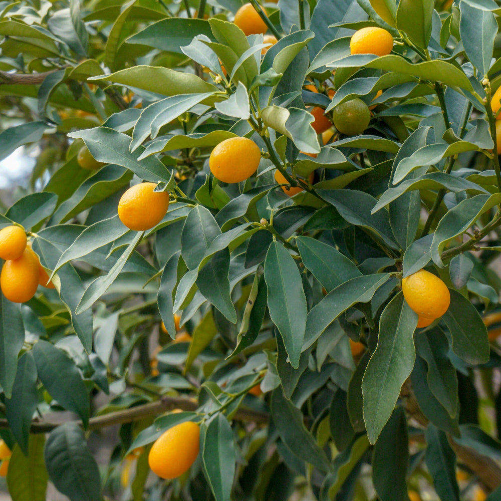 Small, light yellow fruit can be used as a lime substitute. Main crop autumn. Not only is this a great decorative plant the fruit which are produced in good quantities can be used for culinary purposes. Glossy green foliage, fragrant white blossom and small yellow fruit with edible skin that are a cross between a Lime and a Kumquat. Evergreen.